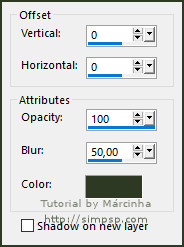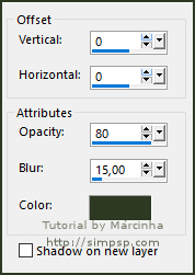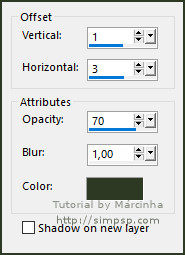 Layers > Merge > Merge Down. Selections > Select None. Effects > 3D Effects > Drop Shadow: com a cor do Foreground: #2e3923