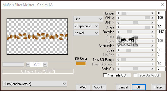 13 - Image > Resize: 50%, all layers desmarcado. Plugin Mura's Meister > Copies. *NOTA: Como eu usei Line (random rotate) - rotação aleatória, cada vez que aplicar, mesmo sendo nas mesmas configurações as posições serão aleatórias.