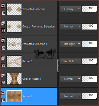 14 - Selections > Select None. Layers > Arrange > Move Down. Layers > Properties > General > Blend Mode: Hard Light, Opacity: 60%. Ativar a Layer Promoted Selection 2. Layer > Merge > Merge Down. Effects > Image Effects > Seamless Tiling.