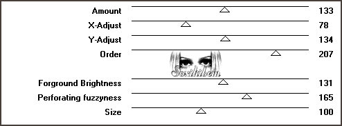 7 - Layers > New Raster Layer. Selections > Load/Save Selections > Load Selection From Disk: 306_xiki1. Flood Fill > Opacity 40%, pintar com a cor do Background. Plugin Tramages > Perforator 1.
