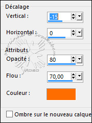 -- 12 -- Effets > Effets 3D > Ombre portée: -15/0/80/70/Couleur: l'arrière-plan: #fd6d02