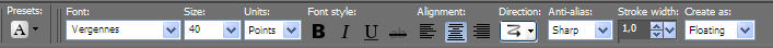 12 - Ative a ferramenta texto. Configure com a fonte Vergennes conforme o print abaixo.