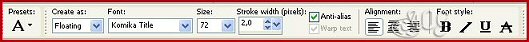 13- Adicionar uma nova layer e puxá-la para baixo da layer Tube Colocar a cor Preta no Foreground e deixar a cor #B7000E no Background Com a ferramenta Text configurada conforme o print abaixo, escrever o Nome