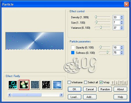 14- Ativar a layer Efeito 2 Effects > Plugin Ulead Effects > Particle, como usado anteriormente, só mudando Density para 53 e Variance para 47 Fechar a layer Efeito 2