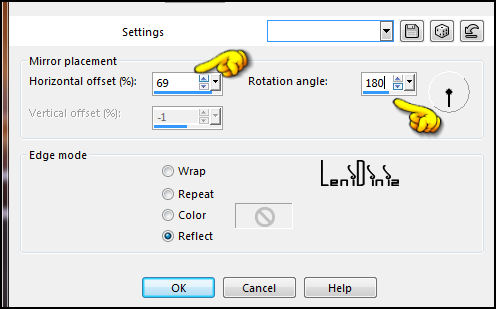 05- Layers > Merge > Merge Down. Effects > Plugins > Filters Unlimited > James Bondage: 06- Effects > Reflection Effects > Rotating Mirror. 07- Effects > Edge Effects > Enhance More. 08- Edith > Copy no decor_leni_noah No trabalho... Edit > Paste as New Layer. Layers > Properties > General > Blend Mode: Overlay 09- Edith > Copy no misted floral. No trabalho... Edit > Paste as New Layer. Image > Resize: 75% - all layers desmarcado. Posicionar um pouco mais para cima como no trabalho final. No meu trabalho, a posição ficou: Ferramenta Pick Tool: Position X: 276 Position Y: 8. Você pode posicionar como preferir. Adjust > Sharpness > Sharpen.