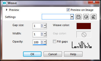 13- Effects > Texture Effects > Weave. 14- Selections > Invert. Effects > 3D Effects > Drop Shadow: 0, 0, 100, 50 color #000000. 15- Edit > Copy no decor_leni_noah-2 No trabalho... Ferramenta Pick Tool: Position X: 781 Position Y: 112. Effects > 3D Effects > Drop Shadow: 1, 1, 100, 1 color #000000. 16- Edit > Copy no decor_leni_noah-3 No trabalho... Ferramenta Pick Tool: Position X: 20 Position Y: 21. Effects > 3D Effects > Drop Shadow: 1, 1, 100, 1 color #000000. 17- Edit > Copy no tube principal No trabalho... Resize se for necessário: o tube do material foi de 78%. Posicionar à esquerda Adjust > Sharpness > Sharpen. Effects > 3D Effects > Drop Shadow como preferir. 18- Edit > Copy no título_leni_noah. No trabalho... Edit > Paste as New Layer. Posicionar onde preferir Effects > 3D Effects > Drop Shadow à gosto. 19- Image > Add Borders: 2px - symmetric - color: #531d0f (Background cor escura)